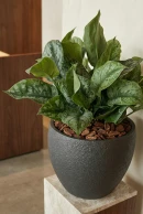 This artificial Scindapsus bush features broad, variegated green leaves with soft silver patterning. The foliage is densely arranged for a full, structured silhouette, making it ideal for consoles, side tables, reception desks, or shelving.